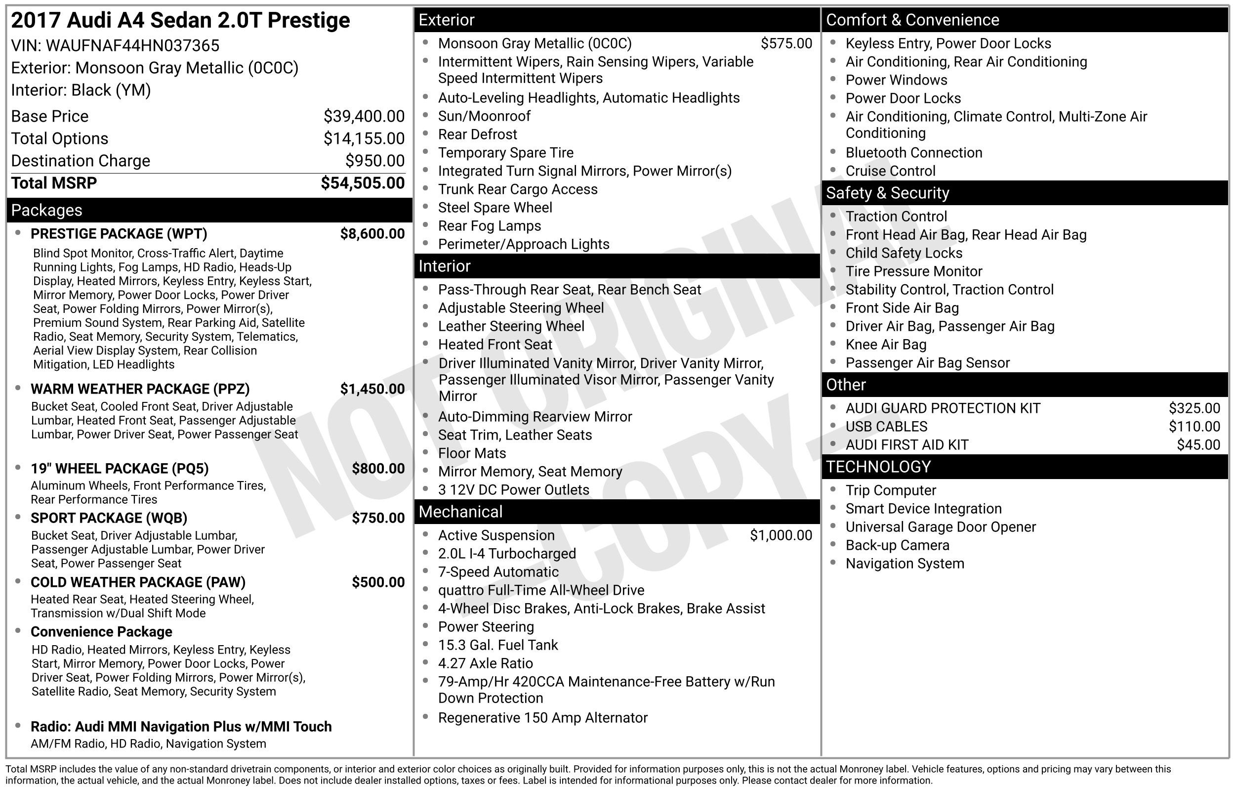 MECHANIC SPECIAL, Bargain Lot Vehicle, Super Clean, A4 2.0T Prestige quattro, 4D Sedan, quattro, Black Leather, 10 Speakers, 19 Wheel Package, 4-Wheel Disc Brakes, ABS brakes, Air Conditioning, Alloy wheels, Aluminum High-Gloss Window Surrounds, AM/FM radio, Anti-whiplash front head restraints, Audi Connect PRIME & PLUS, Audi First Aid Kit, Audi Guard Protection Kit, Audi Virtual Cockpit, Auto-dimming Rear-View mirror, Automatic temperature control, Brake assist, Bumpers: body-color, CD player, Cold Weather Package, Comfort Adaptive Damping Suspension, Compass, Convenience Package, Delay-off headlights, Driver door bin, Driver vanity mirror, Dual front impact airbags, Dual front side impact airbags, Electronic Stability Control, Exterior Parking Camera Rear, Four wheel independent suspension, Front anti-roll bar, Front Bucket Seats, Front Center Armrest, Front dual zone A/C, Front fog lights, Front reading lights, Front Seat Ventilation, Garage door transmitter: HomeLink, Heated door mirrors, Heated Front Seats, High intensity discharge headlights: Xenon plus, Illuminated entry, Knee airbag, Leather Seating Surfaces, Leather Shift Knob, Leather steering wheel, Low tire pressure warning, Occupant sensing airbag, Outside temperature display, Overhead airbag, Overhead console, Panic alarm, Passenger door bin, Passenger vanity mirror, Power door mirrors, Power driver seat, Power Front Bucket Seats, Power moonroof, Power passenger seat, Power steering, Power windows, Prestige Package, Radio data system, Radio: Audi MMI Navigation Plus w/MMI Touch, Radio: Audi Sound System, Rain sensing wipers, Rear air conditioning, Rear anti-roll bar, Rear fog lights, Rear reading lights, Rear seat center armrest, Rear window defroster, Remote keyless entry, SiriusXM Satellite Radio, Speed control, Speed-sensing steering, Speed-Sensitive Wipers, Split folding rear seat, Sport Front Seats, Sport Package, Sport Suspension, Steering wheel mounted audio controls, Tachometer, Technology Package, Telescoping steering wheel, Tilt steering wheel, Traction control, Trip computer, Turn signal indicator mirrors, USB Cables, Variably intermittent wipers, Warm Weather Package, Wheels: 7.5 x 17 5-Parallel Spoke Design, Wheels: 8.5 x 19 Audi Sport 10-V-Spoke Design, Wheels: 8 x 18 5-Spoke Dynamic Design, A4 2.0T Prestige quattro, 4D Sedan, quattro, Black Leather.