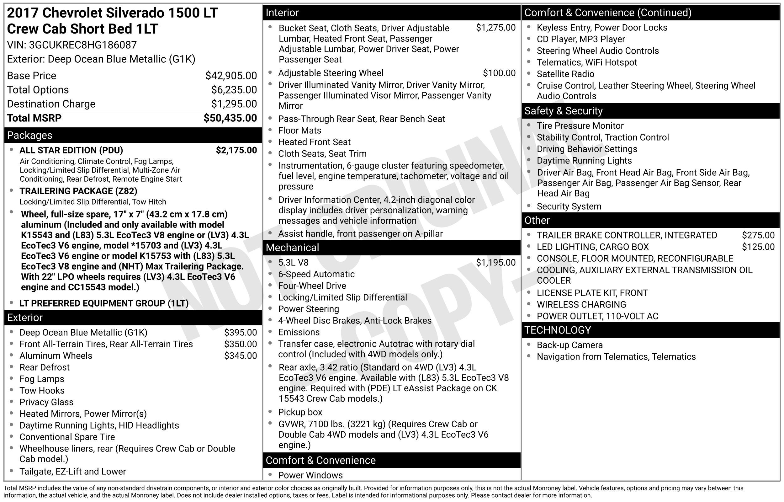 4D Crew Cab, EcoTec3 5.3L V8, 4WD, Black Cloth, 10-Way Power Driver's Seat Adjuster, 110-Volt AC Power Outlet, 150 Amp Alternator, 4-Wheel Disc Brakes, 4.2 Diagonal Color Display Driver Info Center, 40/20/40 Front Split Bench Seat, 6 Speaker Audio System, 6 Speakers, ABS brakes, Air Conditioning, All Star Edition, Alloy wheels, AM/FM radio: SiriusXM, Auxiliary External Transmission Oil Cooler, Bluetooth®® For Phone, Body Color Bodyside Moldings, Body-Color Door Handles, Body-Color Mirror Caps, Body-Color Power Adjustable Heated Outside Mirrors, Bodyside moldings, Brake assist, CD player, Cloth Seat Trim, Color-Keyed Carpeting w/Rubberized Vinyl Floor Mats, Compass, Deep-Tinted Glass, Delay-off headlights, Driver & Front Passenger Illuminated Vanity Mirrors, Driver door bin, Driver vanity mirror, Dual front impact airbags, Dual front side impact airbags, Dual-Zone Automatic Climate Control, Electric Rear-Window Defogger, Electronic Stability Control, Emergency communication system: OnStar Guidance, Exterior Parking Camera Rear, EZ Lift & Lower Tailgate, Floor Mounted Console, Front anti-roll bar, Front Center Armrest w/Storage, Front Chrome Bumper, Front License Plate Kit, Front Power Reclining Bucket Seats, Front reading lights, Front wheel independent suspension, Fully automatic headlights, HD Radio, Heated door mirrors, Heated Driver & Front Passenger Seats, Heavy-Duty Rear Locking Differential, High-Intensity Discharge Headlights, Illuminated entry, Integrated Trailer Brake Controller, Leather Wrapped Steering Wheel w/Cruise Controls, LED Cargo Box Lighting, Low tire pressure warning, Manual Tilt Wheel Steering Column, Manual Tilt/Telescoping Steering Column, Occupant sensing airbag, OnStar 3 Months Guidance Plan, OnStar w/4G LTE, Outside temperature display, Overhead airbag, Overhead console, Panic alarm, Passenger door bin, Passenger vanity mirror, Power door mirrors, Power steering, Power windows, Power Windows w/Driver Express Up, Premium audio system: Chevrolet MyLink, Radio data system, Radio: AM/FM 8 Diagonal Color Touch Screen, Rear 60/40 Folding Bench Seat (Folds Up), Rear Chrome Bumper, Rear reading lights, Rear seat center armrest, Rear step bumper, Rear Vision Camera, Rear Wheelhouse Liners, Remote Keyless Entry, Remote keyless entry, Remote Locking Tailgate, Remote Vehicle Starter System, Single Slot CD/MP3 Player, SiriusXM Satellite Radio, Speed control, Speed-sensing steering, Split folding rear seat, Steering Wheel Audio Controls, Steering wheel mounted audio controls, Tachometer, Theft Deterrent System (Unauthorized Entry), Thin Profile LED Fog Lamps, Tilt steering wheel, Traction control, Trailering Package, Trip computer, Variably intermittent wipers, Voltmeter, Wireless Charging, 4D Crew Cab, EcoTec3 5.3L V8, 4WD, Black Cloth.