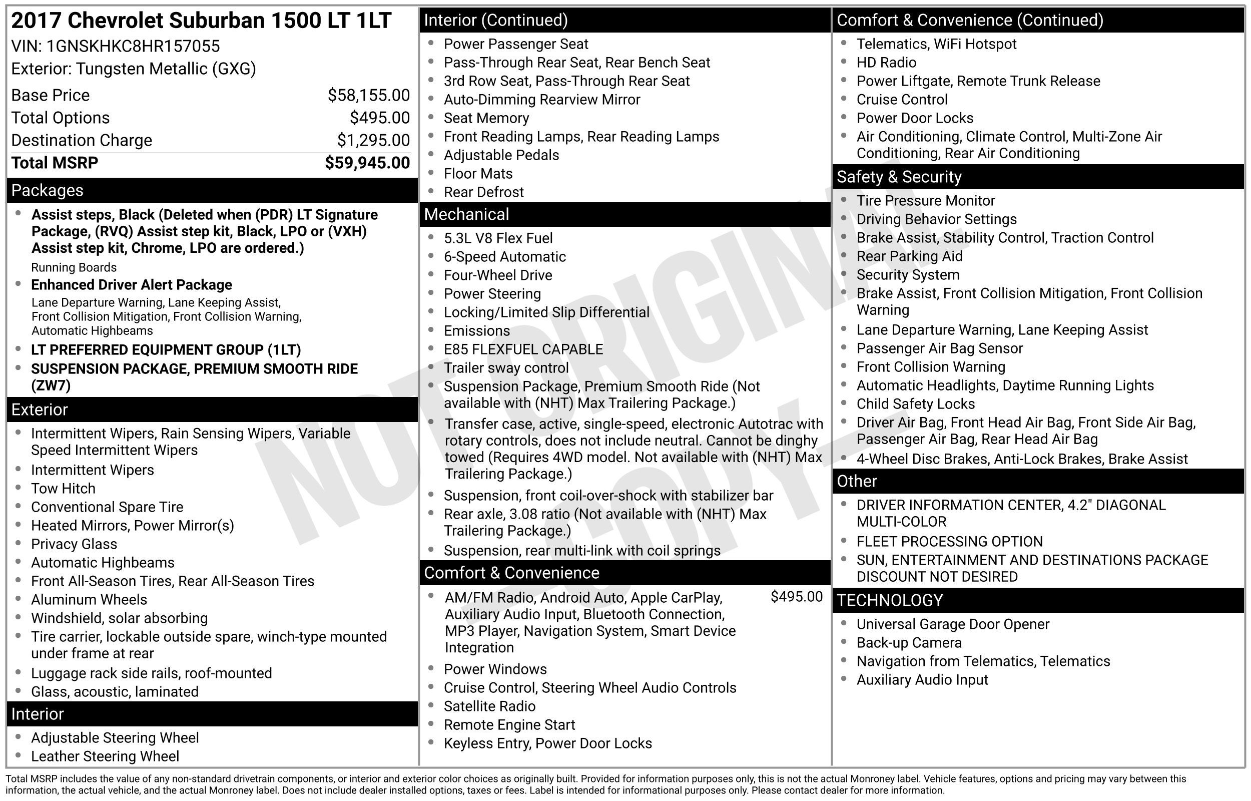 Back-up Camera, Remote Start, Super Clean, Clean CarFax, Suburban LT, EcoTec3 5.3L V8 Flex Fuel, 4WD, 18 x 8.5 High-Polished Aluminum Finish Wheels, 1st & 2nd Row Color-Keyed Carpeted Floor Mats, 2nd Row 60/40 Split-Folding Manual Bench, 3.08 Rear Axle Ratio, 3rd Row Manual 60/40 Split-Folding Fold Flat Bench, 3rd row seats: split-bench, 4-Wheel Antilock Disc Brakes, 4-Wheel Disc Brakes, 6-Way Power Front Passenger Seat Adjuster, 9 Speakers, ABS brakes, Adjustable pedals, Air Conditioning, Alloy wheels, AM/FM radio: SiriusXM, Apple CarPlay, Auto High-beam Headlights, Auto-dimming door mirrors, Auto-Dimming Inside Rear-View Mirror, Auto-dimming Rear-View mirror, Automatic temperature control, Black Assist Steps, Bose Premium Audio System Feature, Brake assist, Bumpers: body-color, CD player, Color-Keyed Carpeting Floor Covering, Compass, Delay-off headlights, Driver door bin, Driver Inboard & Front Passenger Airbags, Driver vanity mirror, Dual front impact airbags, Dual front side impact airbags, Electronic Cruise Control w/Set & Resume Speed, Electronic Stability Control, Emergency communication system: OnStar Guidance, Enhanced Driver Alert Package, Enhanced Driver Information Center, Extended-Range Remote Keyless Entry, Exterior Parking Camera Rear, Floor Console w/Storage Area, Forward Collision Alert Sensor Indicator, Front anti-roll bar, Front Bucket Seats, Front Center Armrest, Front dual zone A/C, Front reading lights, Front wheel independent suspension, Fully automatic headlights, Garage door transmitter, HD Radio, Heated door mirrors, Heated Front Reclining Bucket Seats, Heated front seats, Illuminated entry, Intellibeam Headlamps w/Automatic High Beam On/Off, Lane Keep Assist, Leather-Appointed Seat Trim, Leather-Wrapped Steering Wheel, Low Speed Forward Automatic Braking, Low tire pressure warning, Memory seat, Memory Settings, NavTraffic, Occupant sensing airbag, OnStar Basic Plan For 5 Years, Outside temperature display, Overhead airbag, Overhead console, Panic alarm, Passenger door bin, Passenger vanity mirror, Pedal memory, Power door mirrors, Power driver seat, Power Liftgate, Power passenger seat, Power steering, Power windows, Power-Adjustable Accelerator & Brake Pedals, Preferred Equipment Group 1LT, Premium Smooth Ride Suspension Package, Radio: Chevrolet MyLink AM/FM Stereo, Radio: Chevrolet MyLink AM/FM Stereo w/Navigation, Rain sensing wipers, Rear air conditioning, Rear anti-roll bar, Rear Park Assist w/Audible Warning, Rear reading lights, Rear seat center armrest, Rear window defroster, Rear window wiper, Remote keyless entry, Remote Vehicle Start, Roof rack: rails only, Roof-Mounted Luggage Rack Side Rails, Safety Alert Driver Seat, Security system, Single-Slot CD/MP3 Player, SiriusXM Satellite Radio, Speed control, Speed-sensing steering, Split folding rear seat, Spoiler, Steering wheel mounted audio controls, Tachometer, Telescoping steering wheel, Tilt steering wheel, Traction control, Trip computer, Universal Home Remote, Variably intermittent wipers, Voltmeter, Suburban LT, EcoTec3 5.3L V8 Flex Fuel, 4WD.