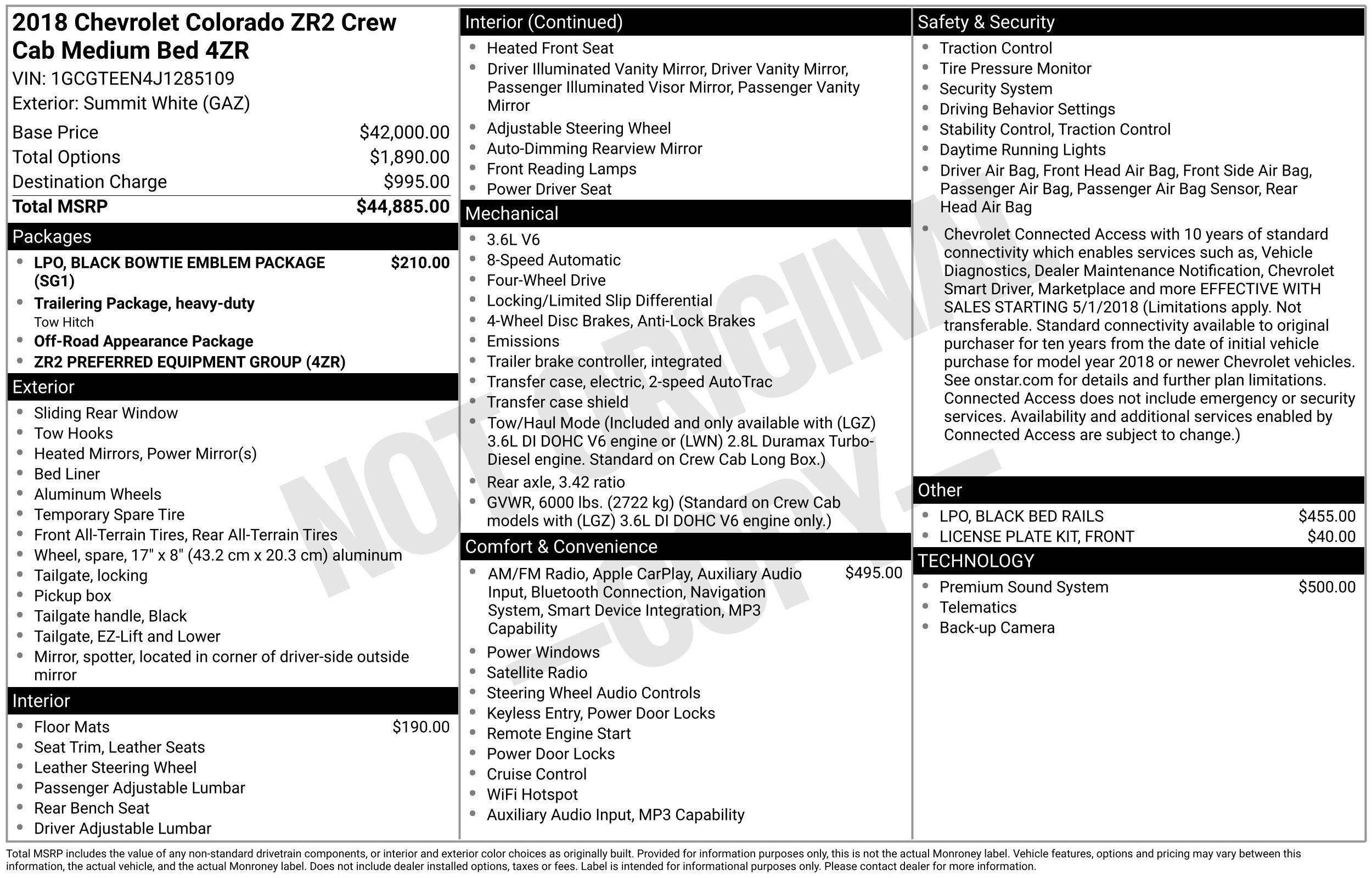 Back-up Camera, Remote Start, Super Clean, Colorado ZR2, 4WD, Black Leather, 17 x 8 Aluminum Wheels, 3.42 Rear Axle Ratio, 4-Way Power Front Passenger Seat Adjuster, 4-Wheel Disc Brakes, 6 Speakers, 6-Speaker Audio System Feature, ABS brakes, Air Conditioning, All-Weather Floor Liner (LPO), Alloy wheels, AM/FM radio: SiriusXM, Apple CarPlay, Auto-dimming Rear-View mirror, Automatic temperature control, Black Bed Rails (LPO), Black Bowtie Emblem Package (LPO), Black Rear Bumpers, Black Spray-On Bedliner w/Chevrolet Logo, Bose Premium 7-Speaker Audio System Feature, Compass, Delay-off headlights, Driver 4-Way Power Seat Adjuster, Driver door bin, Driver vanity mirror, Driver-Selectable Full-Locking Front Differential, Driver-Selectable Full-Locking Rear Differential, Dual front impact airbags, Dual front side impact airbags, Electronic Stability Control, Exterior Parking Camera Rear, Front anti-roll bar, Front Bucket Seats, Front Center Armrest, Front fog lights, Front License Plate Kit, Front reading lights, Front wheel independent suspension, Fully automatic headlights, Heated door mirrors, Heated Driver & Front Passenger Seats, Heated front seats, Heavy-Duty Trailering Package, Hitch Guidance, Illuminated entry, Integrated Trailer Brake Controller, Leather-Appointed Seat Trim, Low tire pressure warning, Occupant sensing airbag, Off-Road Appearance Package, Outside temperature display, Overhead airbag, Overhead console, Panic alarm, Passenger door bin, Passenger vanity mirror, Power door mirrors, Power Driver Lumbar Control Seat Adjuster, Power driver seat, Power Passenger Lumbar Control Seat Adjuster, Power passenger seat, Power steering, Power windows, Preferred Equipment Group 4ZR, Premium audio system: Chevrolet MyLink, Radio data system, Radio: AM/FM Stereo w/8 Diagonal Color Touch Nav., Radio: AM/FM Stereo w/8 Diagonal Color Touch Screen, Rear reading lights, Rear seat center armrest, Rear step bumper, Rear window defroster, Remote keyless entry, Security system, SiriusXM Satellite Radio, Speed control, Speed-sensing steering, Steering wheel mounted audio controls, Tachometer, Telescoping steering wheel, Tilt steering wheel, Tow/Haul Mode, Traction control, Trip computer, Variably intermittent wipers, Colorado ZR2, 4WD, Black Leather.