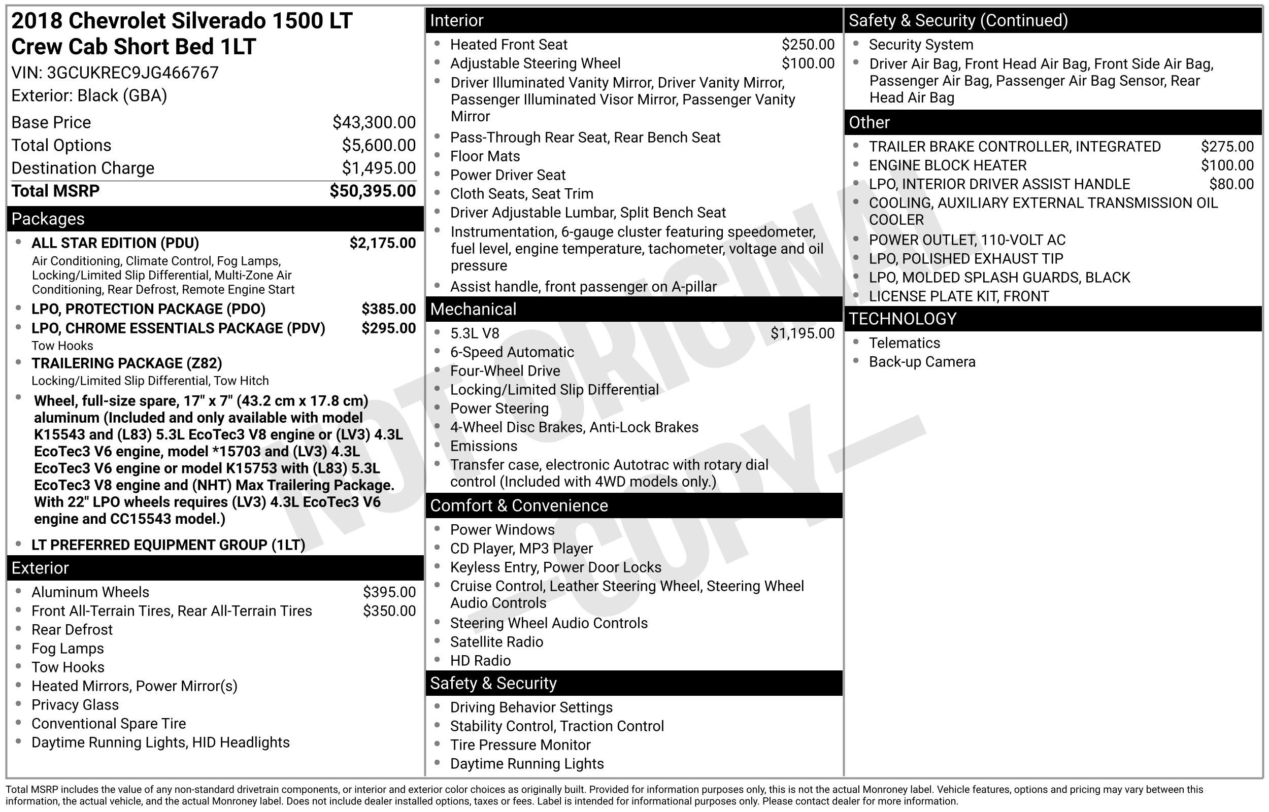 Back-up Camera, Remote Start, Super Clean, Clean CarFax, Silverado 1500 LT LT1, 4D Crew Cab, EcoTec3 5.3L V8, 4WD, Black Cloth, 10-Way Power Driver's Seat Adjuster, 110-Volt AC Power Outlet, 150 Amp Alternator, 4-Wheel Disc Brakes, 4.2 Diagonal Color Display Driver Info Center, 40/20/40 Front Split Bench Seat, 6 Speaker Audio System, 6 Speakers, ABS brakes, Air Conditioning, All Star Edition, All-Weather Floor Liner (LPO), Alloy wheels, AM/FM radio: SiriusXM, Auxiliary External Transmission Oil Cooler, Bluetooth®® For Phone, Body Color Bodyside Moldings, Body-Color Door Handles, Body-Color Mirror Caps, Body-Color Power Adjustable Heated Outside Mirrors, Bodyside moldings, Brake assist, CD player, Chevrolet Connected Access, Chevrolet w/4G LTE, Chrome Essentials Package (LPO), Chrome Recovery Hooks, Cloth Seat Trim, Color-Keyed Carpeting w/Rubberized Vinyl Floor Mats, Compass, Deep-Tinted Glass, Delay-off headlights, Driver & Front Passenger Illuminated Vanity Mirrors, Driver door bin, Driver vanity mirror, Dual front impact airbags, Dual front side impact airbags, Dual-Zone Automatic Climate Control, Electric Rear-Window Defogger, Electronic Stability Control, Engine Block Heater, Exterior Parking Camera Rear, EZ Lift & Lower Tailgate, Front anti-roll bar, Front Center Armrest w/Storage, Front Chrome Bumper, Front License Plate Kit, Front reading lights, Front wheel independent suspension, Fully automatic headlights, HD Radio, Heated door mirrors, Heated Driver & Front Passenger Seats, Heavy-Duty Rear Locking Differential, High-Intensity Discharge Headlights, Illuminated entry, Integrated Trailer Brake Controller, Interior Driver Assist Handle (LPO), Leather Wrapped Steering Wheel w/Cruise Controls, Low tire pressure warning, Manual Tilt Wheel Steering Column, Manual Tilt/Telescoping Steering Column, Molded Black Splash Guards (LPO), Occupant sensing airbag, OnStar & Chevrolet Connected Services Capable, Outside temperature display, Overhead airbag, Overhead console, Panic alarm, Passenger door bin, Passenger vanity mirror, Polished Exhaust Tip, Power door mirrors, Power steering, Power windows, Power Windows w/Driver Express Up, Premium audio system: Chevrolet MyLink, Protection Package, Radio data system, Radio: AM/FM 8 Diagonal Color Touch Screen, Rear 60/40 Folding Bench Seat (Folds Up), Rear Chrome Bumper, Rear reading lights, Rear seat center armrest, Rear step bumper, Rear Wheelhouse Liners, Remote Keyless Entry, Remote keyless entry, Remote Locking Tailgate, Remote Vehicle Starter System, Single Slot CD/MP3 Player, SiriusXM Satellite Radio, Speed control, Speed-sensing steering, Split folding rear seat, Steering Wheel Audio Controls, Steering wheel mounted audio controls, Tachometer, Theft Deterrent System (Unauthorized Entry), Thin Profile LED Fog Lamps, Tilt steering wheel, Traction control, Trailering Package, Trip computer, Variably intermittent wipers, Voltmeter, Silverado 1500 LT LT1, 4D Crew Cab, EcoTec3 5.3L V8, 4WD, Black Cloth.