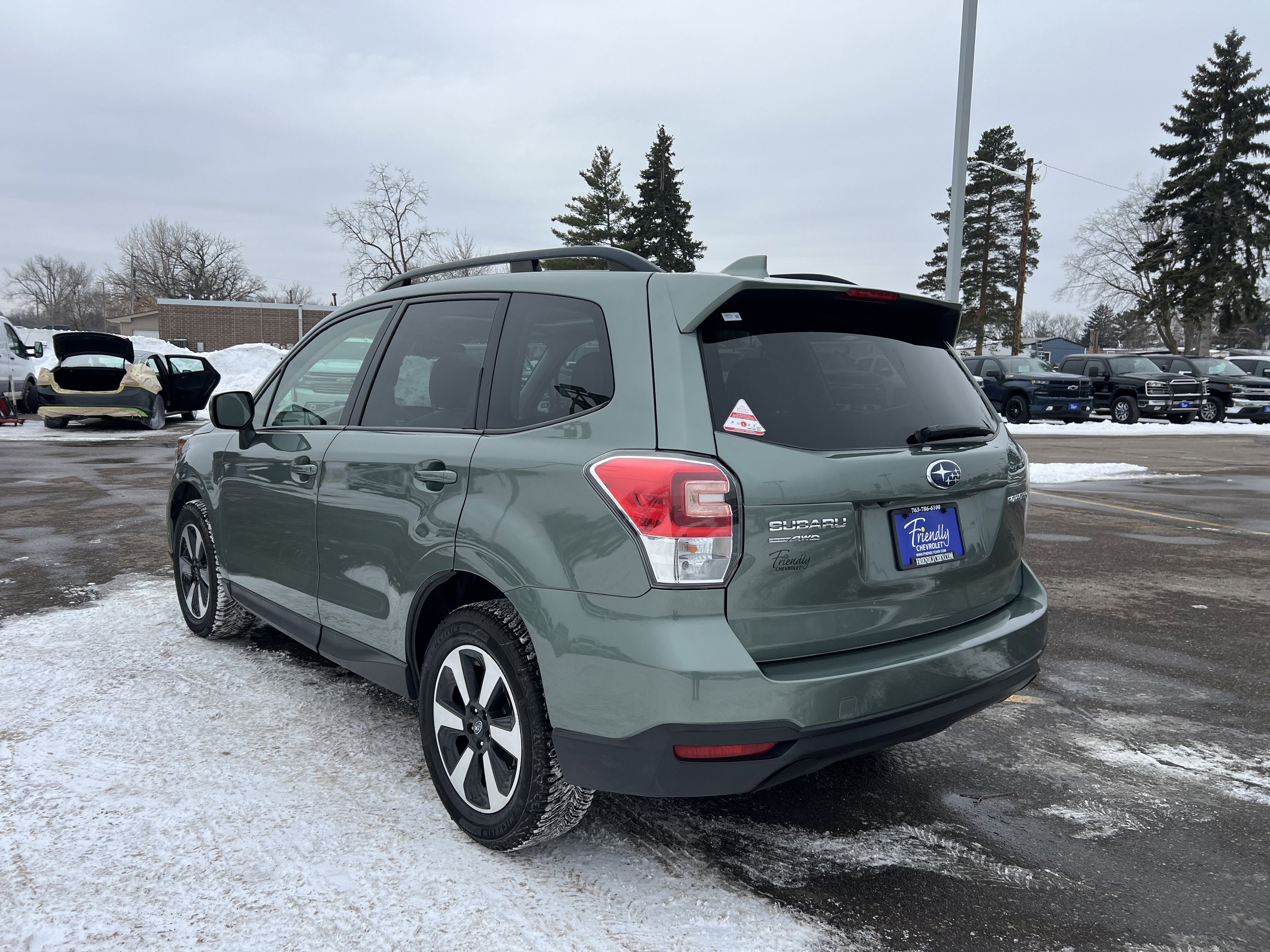 Recent Arrival! 2018 Subaru Forester 2.5i Premium Jasmine Green Metallic 4D Sport Utility AWD Lineartronic CVT 2.5L 4-Cylinder DOHC 16V VVTBack-up Camera, Super Clean, Forester 2.5i Premium, 2.5L 4-Cylinder DOHC 16V VVT, AWD, 3.70 Axle Ratio, 4-Wheel Disc Brakes, 6 Speakers, ABS brakes, Air Conditioning, Alloy wheels, AM/FM radio: SiriusXM, Automatic temperature control, Brake assist, Bumpers: body-color, CD player, Driver door bin, Driver vanity mirror, Dual front impact airbags, Dual front side impact airbags, Electronic Stability Control, Emergency communication system: STARLINK, Exterior Parking Camera Rear, Four wheel independent suspension, Front anti-roll bar, Front Bucket Seats, Front Center Armrest, Front reading lights, Illuminated entry, Knee airbag, Low tire pressure warning, Occupant sensing airbag, Outside temperature display, Overhead airbag, Overhead console, Panic alarm, Passenger door bin, Passenger vanity mirror, Power door mirrors, Power driver seat, Power moonroof, Power steering, Power windows, Radio data system, Radio: Subaru Starlink 7.0 Multimedia Plus System, Rear anti-roll bar, Rear seat center armrest, Rear window defroster, Rear window wiper, Remote keyless entry, Roof rack: rails only, Security system, Speed control, Split folding rear seat, Spoiler, Steering wheel mounted audio controls, Tachometer, Telescoping steering wheel, Tilt steering wheel, Traction control, Trip computer, Variably intermittent wipers, Forester 2.5i Premium, 2.5L 4-Cylinder DOHC 16V VVT, AWD.26/32 City/Highway MPGAwards:* 2018 KBB.com 10 Best All-Wheel-Drive Vehicles Under $25,000 * 2018 KBB.com 10 Best SUVs Under $25,000 * 2018 KBB.com Brand Image Awards * 2018 KBB.com 10 Most Awarded BrandsFriendly Chevrolet is the Friendly that made Fridley FAMOUS!