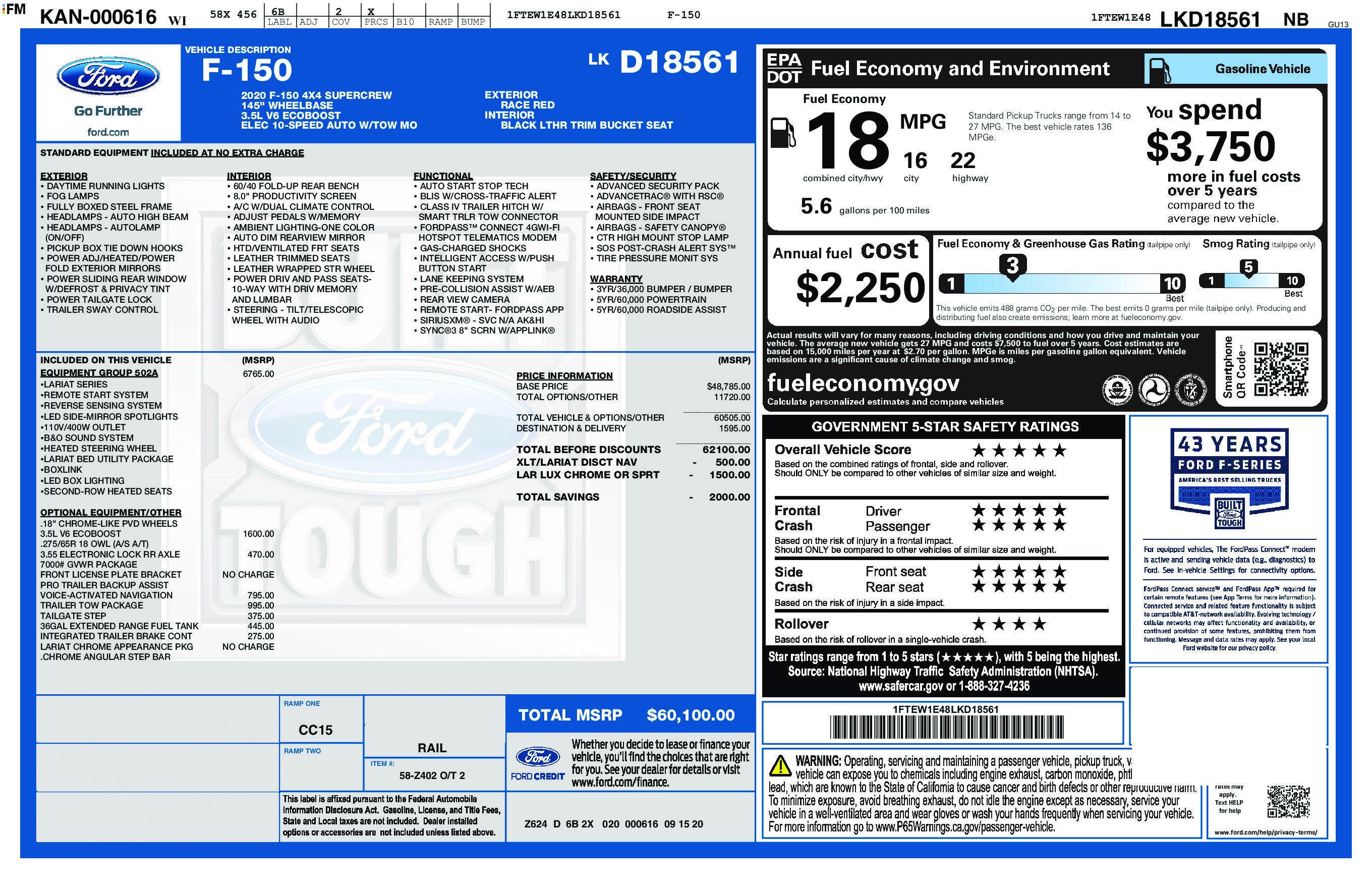 2020 Ford F-150 Lariat Race Red 4D SuperCrew 4WD 10-Speed Automatic 3.5L V6 EcoBoostBack-up Camera, Super Clean, F-150 Lariat, 3.5L V6 EcoBoost, 4WD, 110V/400W Outlet, 18 Machined-Aluminum Wheels, 2nd Row Heated Seats, 4-Wheel Disc Brakes, 7 Speakers, ABS brakes, Adjustable pedals, Air Conditioning, Alloy wheels, AM/FM radio: SiriusXM, Auto High-beam Headlights, Auto-dimming door mirrors, Auto-dimming Rear-View mirror, Automatic temperature control, Brake assist, Bumpers: chrome, Chrome 2-Bar Grille w/4 Minor Bars, Chrome Angular Step Bars, Chrome Door & Tailgate Handles w/Body-Color Bezel, Chrome Skull Caps on Exterior Mirrors, Class IV Trailer Hitch Receiver, Compass, Delay-off headlights, Driver door bin, Driver vanity mirror, Dual front impact airbags, Dual front side impact airbags, Electronic Stability Control, Emergency communication system: SYNC 3 911 Assist, Engine Oil Cooler, Equipment Group 502A Luxury, Extended Range 36 Gallon Fuel Tank, Exterior Parking Camera Rear, Front anti-roll bar, Front Center Armrest w/Storage, Front dual zone A/C, Front fog lights, Front License Plate Bracket, Front reading lights, Front wheel independent suspension, Fully automatic headlights, GVWR: 7,050 lbs Payload Package, Heated door mirrors, Heated front seats, Heated Steering Wheel, Illuminated entry, Integrated Trailer Brake Controller, Lariat Bed Utility Package, Lariat Chrome Appearance Package, Leather-Trimmed 40/20/40 Front Seat, Leather-Trimmed Bucket Seats, LED Sideview Mirror Spotlights, Low tire pressure warning, Memory seat, Occupant sensing airbag, Outside temperature display, Overhead airbag, Overhead console, Panic alarm, Passenger door bin, Passenger vanity mirror, Pedal memory, Power door mirrors, Power driver seat, Power Glass Sideview Mirr w/Body-Color Skull Caps, Power passenger seat, Power steering, Power Tilt/Telescoping Steering Column w/Memory, Power windows, Pro Trailer Backup Assist, Quad Beam LED Headlamps & LED Taillamps/Fog Lamps, Radio data system, Radio: AM/FM Stereo w/6 Speakers, Radio: B&O Sound System by Bang & Olufsen, Rain-Sensing Wipers, Rear reading lights, Rear seat center armrest, Rear step bumper, Rear window defroster, Remote keyless entry, Remote Start System w/Remote Tailgate Release, Reverse Sensing System, Security system, Single-Tip Chrome Exhaust, SiriusXM Radio, Speed control, Speed-sensing steering, Split folding rear seat, Steering wheel mounted audio controls, SYNC 3, Tachometer, Tailgate Step w/Tailgate Lift Assist, Telescoping steering wheel, Tilt steering wheel, Traction control, Trailer Tow Package, Trip computer, Turn signal indicator mirrors, Universal Garage Door Opener, Upgraded Front Stabilizer Bar, Variably intermittent wipers, Ventilated front seats, Voice-Activated Touchscreen Navigation, Voltmeter, Wheels: 18 Chrome-Like PVD, Windshield Wiper De-Icer, F-150 Lariat, 3.5L V6 EcoBoost, 4WD.Odometer is 7689 miles below market average!Friendly Chevrolet is the Friendly that made Fridley FAMOUS!