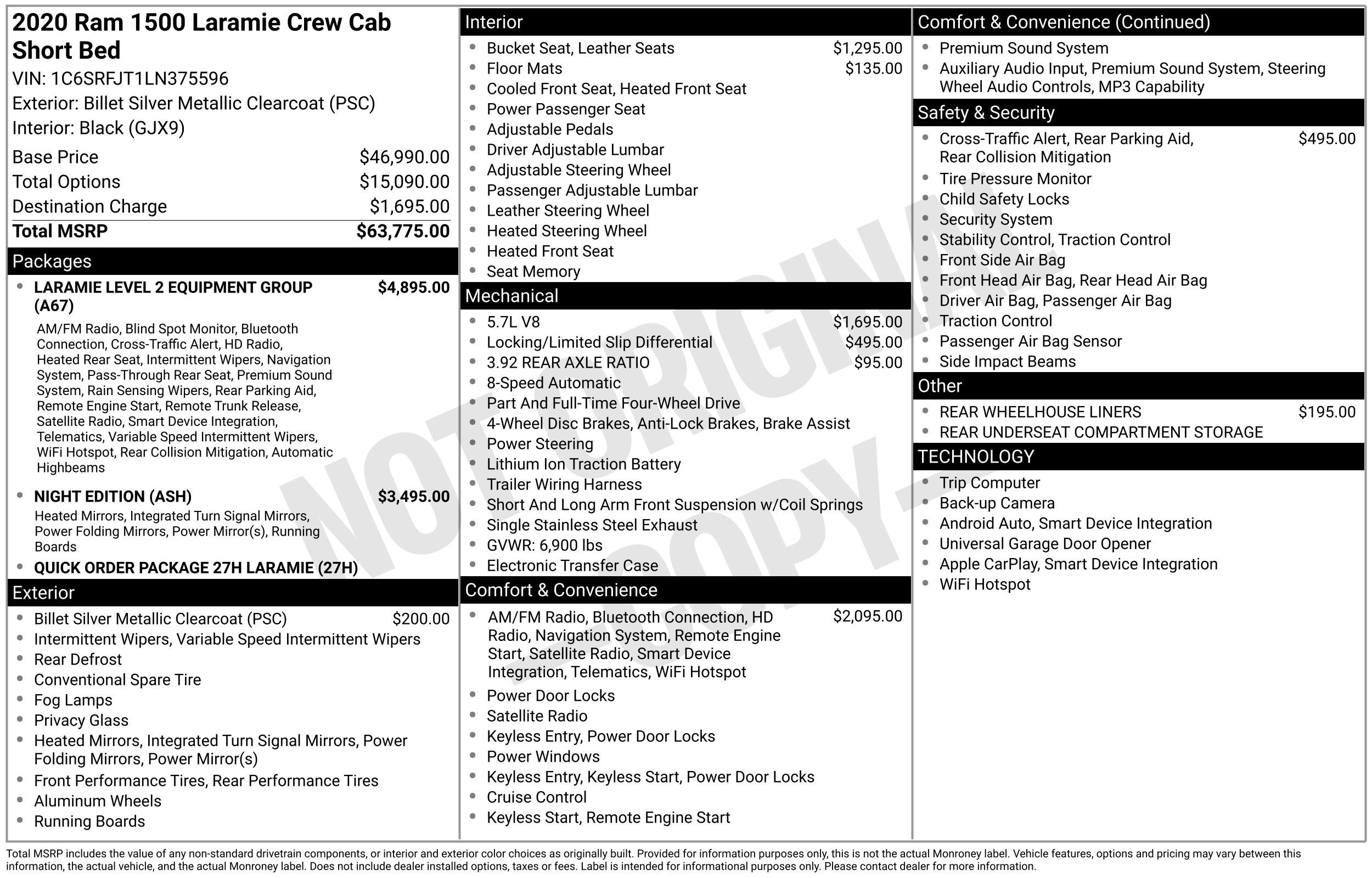 Back-up Camera, Remote Start, Super Clean, 1500 Laramie, 4WD, Black Leather, #1 Seat Foam Cushion, 1-Yr SiriusXM Guardian Trial, 10 Speakers, 12 Touchscreen Display, 3 Rear Seat Head Restraints, 4 Way Front Headrests, 4-Wheel Disc Brakes, 48V Belt Starter Generator, 4G LTE Wi-Fi Hot Spot, 5-Year SiriusXM Traffic Service, 5-Year SiriusXM Travel Link Service, 8.4 Touchscreen Display, ABS brakes, Adjustable pedals, Air Conditioning, Alloy wheels, AM/FM radio: SiriusXM, Anti-Spin Differential Rear Axle, Apple CarPlay, Apple CarPlay/Android Auto, Audio memory, Auto-dimming door mirrors, Auto-dimming Rear-View mirror, Automatic temperature control, Black Tubular Side Steps (DISC), Brake assist, Bumpers: chrome, Compass, Delay-off headlights, Disassociated Touchscreen Display, Driver door bin, Driver Seat Memory, Driver vanity mirror, Dual front impact airbags, Dual front side impact airbags, Electronic Stability Control, For Details, Visit DriveUconnect.com, Front & Rear Rubber Floor Mats, Front anti-roll bar, Front Center Armrest w/Storage, Front dual zone A/C, Front fog lights, Front reading lights, Front Seat Back Map Pockets, Front wheel independent suspension, Fully automatic headlights, Garage door transmitter, Google Android Auto, GPS Antenna Input, GPS Navigation, HD Radio, Heated door mirrors, Heated Front Seats, Heated front seats, Heated Steering Wheel, Heated steering wheel, Illuminated entry, Integrated Center Stack Radio, Laramie Level 2 Equipment Group, Leather steering wheel, Leather Trim 40/20/40 Bench Seat, Leather Trimmed Bucket Seats, Low tire pressure warning, Memory seat, Night Edition, Occupant sensing airbag, Outside temperature display, Overhead airbag, Overhead console, Panic alarm, ParkSense Front/Rear Park Assist w/Stop (DISC), ParkView Rear Back-Up Camera, Passenger door bin, Passenger vanity mirror, Pedal memory, Power 4-Way Driver Lumbar Adjust, Power 4-Way Passenger Lumbar Adjust, Power 8-Way Driver & Passenger Seats, Power door mirrors, Power driver seat, Power passenger seat, Power steering, Power windows, Quick Order Package 27H Laramie, Radio data system, Radio: Uconnect 12 w/Navigation, Radio: Uconnect 4 w/8.4 Display, Rear anti-roll bar, Rear seat center armrest, Rear step bumper, Rear Underseat Compartment Storage, Rear Wheelhouse Liners, Rear window defroster, Remote keyless entry, Security system, SiriusXM Satellite Radio, SiriusXM Traffic Plus, SiriusXM Travel Link, SiriusXM w/360L, Speed control, Split folding rear seat, Steering wheel mounted audio controls, Tachometer, Telescoping steering wheel, Tilt steering wheel, Traction control, Trip computer, Turn signal indicator mirrors, USB Host Flip, Variably intermittent wipers, Ventilated Front Seats, Ventilated front seats, Voltmeter, Wheels: 18 x 8 Aluminum Base Painted, Wheels: 22 x 9 Forged Aluminum, 1500 Laramie, 4WD, Black Leather.