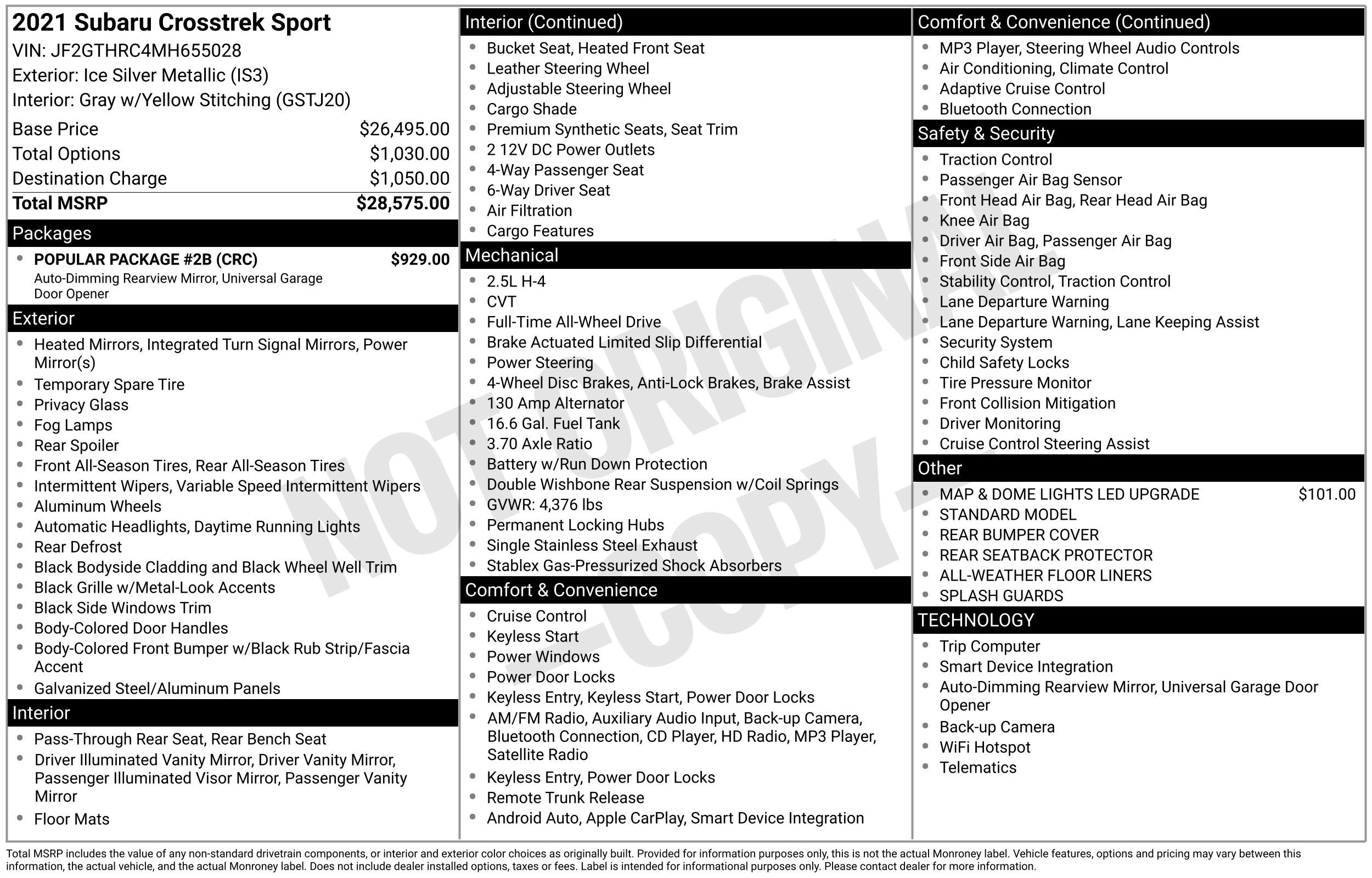 Recent Arrival! 2021 Subaru Crosstrek Sport Ice Silver Metallic 4D Sport Utility AWD Lineartronic CVT 2.5L DOHCCrosstrek Sport, 2.5L DOHC, AWD, Gray W/Yellow Stitching Premium Synthetic, 3.70 Axle Ratio, 4-Wheel Disc Brakes, 6 Speakers, ABS brakes, Air Conditioning, All-Weather Floor Liners, Alloy wheels, AM/FM radio: SiriusXM, Anti-whiplash front head restraints, Auto-Dimming Mirror w/Compass & HomeLink, Automatic temperature control, Brake assist, Bumpers: body-color, CD player, Driver door bin, Driver vanity mirror, Dual front impact airbags, Dual front side impact airbags, Electronic Stability Control, Emergency communication system: STARLINK Safety and Security (Subscription Required), Exterior Parking Camera Rear, Four wheel independent suspension, Front anti-roll bar, Front Bucket Seats, Front Center Armrest, Front fog lights, Front reading lights, Fully automatic headlights, Heated door mirrors, Heated Front Bucket Seats, Heated front seats, Illuminated entry, Knee airbag, Leather Shift Knob, Low tire pressure warning, Map & Dome Lights LED Upgrade, Occupant sensing airbag, Outside temperature display, Overhead airbag, Overhead console, Panic alarm, Passenger door bin, Passenger vanity mirror, Popular Package #2B, Power door mirrors, Power steering, Power windows, Radio data system, Radio: Subaru STARLINK 6.5 Multimedia Plus System, Rear anti-roll bar, Rear Bumper Cover, Rear Seatback Protector, Rear window defroster, Rear window wiper, Remote keyless entry, Security system, Speed control, Speed-sensing steering, Splash Guards, Split folding rear seat, Spoiler, Standard Model, STARLINK/Apple CarPlay/Android Auto, StarTex Upholstery, Steering wheel mounted audio controls, Subaru STARLINK Smartphone Integration, Tachometer, Telescoping steering wheel, Tilt steering wheel, Traction control, Trip computer, Turn signal indicator mirrors, Variably intermittent wipers, Wheels: 17 Alloy Dark Gray Finish Sport Type, Crosstrek Sport, 2.5L DOHC, AWD, Gray W/Yellow Stitching Premium Synthetic.Odometer is 14702 miles below market average! 27/34 City/Highway MPGAwards:* ALG Residual Value Awards, Residual Value AwardsFriendly Chevrolet is the Friendly that made Fridley FAMOUS!