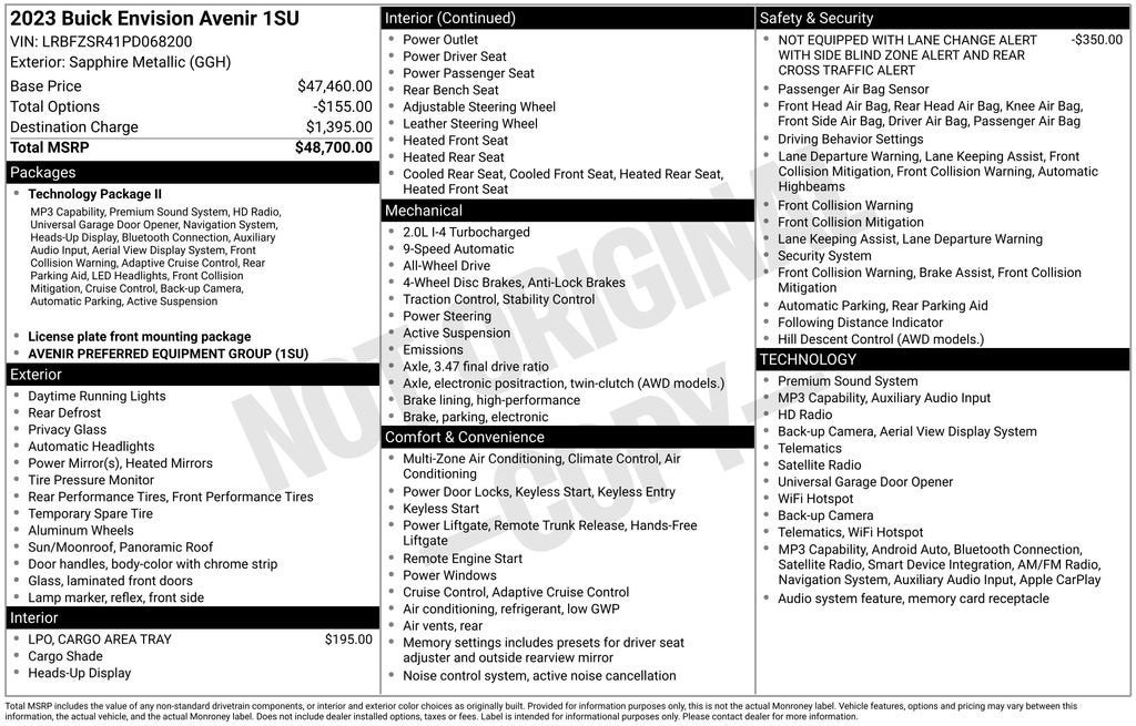 CarBravo Certified, **NICE CARE** Warranty on Brake Pads, Tires, Belts, Battery, Bulbs, Hoses, Spark Plugs and Wiper Bl, Back-up Camera, Remote Start, Super Clean, Envision Avenir, CarBravo GM Certified Certified, 2.0L Turbocharged, AWD, 3.47 Final Drive Axle Ratio, 4-Wheel Disc Brakes, 8-Way Power Driver Seat Adjuster, 9 Speakers, ABS brakes, Air Conditioning, Alloy wheels, AM/FM radio: SiriusXM, Apple CarPlay/Android Auto, Auto High-beam Headlights, Auto-dimming door mirrors, Auto-dimming Rear-View mirror, Automatic temperature control, Bose Premium 9-Speaker Audio System Feature, Brake assist, Bumpers: body-color, Cargo Area Tray (LPO), Compass, Delay-off headlights, Driver door bin, Driver vanity mirror, Dual front impact airbags, Dual front side impact airbags, Electronic Stability Control, Emergency communication system: OnStar and Buick connected services capable, Exterior Parking Camera Rear, Following Distance Indicator, Forward Collision Alert, Four wheel independent suspension, Front anti-roll bar, Front Bin Center Console USB Ports, Front Bucket Seats, Front Center Armrest, Front dual zone A/C, Front Passenger 8-Way Power Seat Adjuster, Front Pedestrian Braking, Front reading lights, Fully automatic headlights, Garage door transmitter, HD Radio, Heads-Up Display, Heated door mirrors, Heated Driver & Front Passenger Seats, Heated front seats, Heated Rear Outboard Seating Positions, Heated rear seats, Heated steering wheel, Illuminated entry, IntelliBeam Headlamp Control w/Auto High Beam, Knee airbag, Lane Keep Assist w/Lane Departure Warning, Low tire pressure warning, Memory Card Receptacle Audio System Feature, Memory seat, Navigation System, Not Equipped w/Lane Change & Rear Cross Traffic Alerts, Occupant sensing airbag, Outside temperature display, Overhead airbag, Overhead console, Panic alarm, Passenger door bin, Passenger vanity mirror, Perforated Leather-Appointed Seat Trim, Power door mirrors, Power driver seat, Power Liftgate, Power moonroof, Power passenger seat, Power steering, Power windows, Preferred Equipment Group 1SU, Premium audio system: Bose, Radio data system, Radio: Buick Infotainment System AM/FM w/Nav, Rear anti-roll bar, Rear reading lights, Rear seat center armrest, Rear window defroster, Rear window wiper, Remote keyless entry, Security system, SiriusXM Radio, Speed control, Split folding rear seat, Spoiler, Steering wheel mounted audio controls, Telescoping steering wheel, Tilt steering wheel, Traction control, Trip computer, USB Charging-Only Ports, Variably intermittent wipers, Ventilated Driver & Front Passenger Seats, Ventilated front seats, Wheels: 20 Aluminum w/Avenir Pearl Nickel Finish, Wireless Apple CarPlay/Wireless Android Auto, Envision Avenir, 2.0L Turbocharged, AWD.