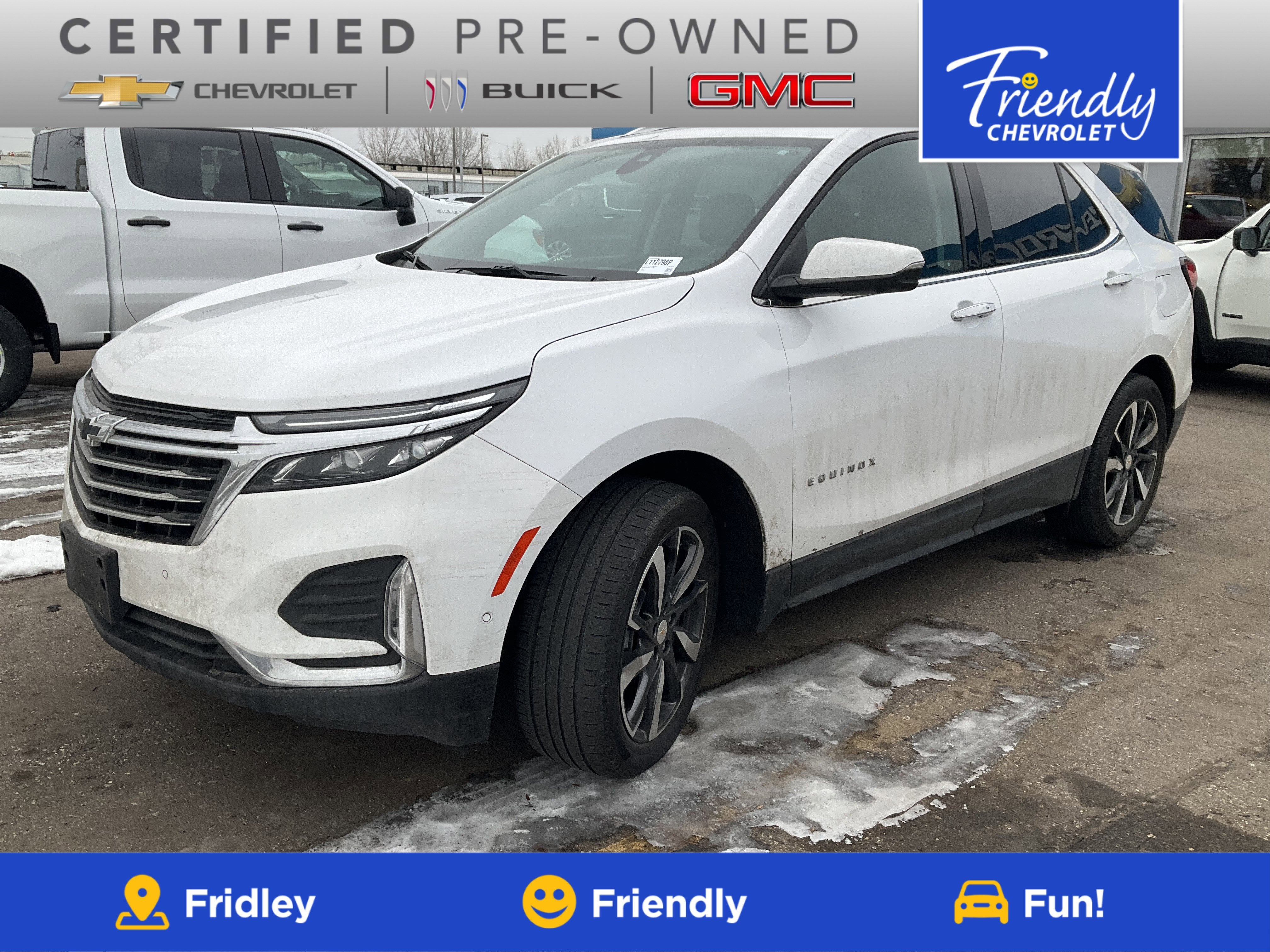 Recent Arrival! Certified. 2023 Chevrolet Equinox Premier Summit White 4D Sport Utility AWD 6-Speed Automatic Electronic with Overdrive 1.5L DOHCCarBravo Certified, **NICE CARE** Warranty on Brake Pads, Tires, Belts, Battery, Bulbs, Hoses, Spark Plugs and Wiper Bl, Back-up Camera, 1 Owner, Remote Start, Super Clean, Clean CarFax, Equinox Premier, CarBravo GM Certified Certified, 1.5L DOHC, AWD, 18 Aluminum Wheels, 19 Aluminum Wheels, 2 Rear USB Charging-Only Ports, 2-Way Power Driver Lumbar Control Seat Adjuster, 3.87 Final Drive Axle Ratio, 4-Wheel Disc Brakes, 6 Speakers, 6-Speaker Audio System Feature, ABS brakes, Adaptive Cruise Control, Air Conditioning, All-Weather Floor Liners (LPO), Alloy wheels, AM/FM radio: SiriusXM, Auto High-beam Headlights, Auto-dimming door mirrors, Auto-dimming Rear-View mirror, Automatic Front & Rear Parking Assist, Automatic temperature control, Bluetooth® For Phone, Brake assist, Bumpers: body-color, Cold Air Grille Shutter, Compass, Confidence & Convenience II Package, Delay-off headlights, Driver 8-Way Power Seat Adjuster, Driver Confidence III Package, Driver Convenience II Package, Driver door bin, Driver vanity mirror, Dual front impact airbags, Dual front side impact airbags, Electronic Stability Control, Emergency communication system: OnStar and Chevrolet connected services capable, Floor Liner Package (LPO), Four wheel independent suspension, Front & Rear Black Bowtie Emblems (LPO), Front anti-roll bar, Front Bucket Seats, Front Center Armrest, Front dual zone A/C, Front fog lights, Front Passenger 4-Way Manual Seat Adjuster, Front Passenger 8-Way Power Seat Adjuster, Front reading lights, Fully automatic headlights, Garage door transmitter, HD Surround Vision, Heated door mirrors, Heated Driver & Front Passenger Seats, Heated front seats, Heated Rear Outboard Seating Positions, Heated steering wheel, Illuminated entry, Integrated Cargo Liner (LPO), Low tire pressure warning, Memory seat, Occupant sensing airbag, Outside temperature display, Overhead airbag, Overhead console, Panic alarm, Passenger door bin, Passenger vanity mirror, Perforated Leather-Appointed Seat Trim, Power door mirrors, Power driver seat, Power Liftgate, Power steering, Power Sunroof, Power windows, Preferred Equipment Group 1LZ, Premium audio system: Chevrolet Infotainment 3 Plus, Radio data system, Radio: Chevrolet Infotainment 3 Plus System, Rear anti-roll bar, Rear reading lights, Rear seat center armrest, Rear window defroster, Rear window wiper, Remote keyless entry, Roof rack: rails only, Security system, SiriusXM Radio, Speed control, Speed-sensing steering, Split folding rear seat, Spoiler, Steering wheel mounted audio controls, Tachometer, Telescoping steering wheel, Tilt steering wheel, Traction control, Trip computer, Turn signal indicator mirrors, Variably intermittent wipers, Ventilated Driver Seat, Ventilated Front Passenger Seat, Wireless Apple CarPlay/Wireless Android Auto, Equinox Premier, 1.5L DOHC, AWD.Odometer is 15715 miles below market average! 24/30 City/Highway MPGCertification Program Details: The CarBravo Bumper-to-Bumper Limited Warranty extension adds 12 months/12,000 miles to the vehicle’s original bumper-to-bumper warranty.Friendly Chevrolet is the Friendly that made Fridley FAMOUS!