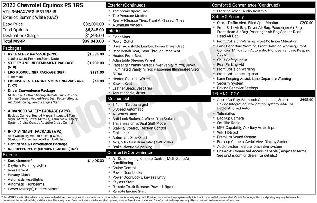CarBravo Certified, **NICE CARE** Warranty on Brake Pads, Tires, Belts, Battery, Bulbs, Hoses, Spark Plugs and Wiper Bl, Remote Start, Super Clean, Clean CarFax, Equinox RS, CarBravo GM Certified Certified, 1.5L DOHC, AWD, 120-Volt Power Outlet, 19 Aluminum Wheels, 2 Rear USB Charging-Only Ports, 2 USB Data Ports, 2 USB Data Ports w/SD Card Reader, 2 USB Ports & Auxiliary Input Jack, 2-Way Power Driver Lumbar Control Seat Adjuster, 3.87 Final Drive Axle Ratio, 4-Wheel Disc Brakes, 6 Speakers, 6-Speaker Audio System Feature, ABS brakes, Adaptive Cruise Control, Advanced Safety Package, Air Conditioning, All-Weather Floor Liners (LPO), Alloy wheels, AM/FM radio: SiriusXM, Auto High-beam Headlights, Automatic temperature control, Bluetooth® For Phone, Bose Premium 7-Speaker Audio System Feature, Brake assist, Bumpers: body-color, Cold Air Grille Shutter, Compass, Delay-off headlights, Driver 8-Way Power Seat Adjuster, Driver door bin, Driver Seatback Map Pocket, Driver vanity mirror, Dual front impact airbags, Dual front side impact airbags, Electronic Stability Control, Emergency communication system: OnStar and Chevrolet connected services capable, Floor Liner Package (LPO), Four wheel independent suspension, Front anti-roll bar, Front Bucket Seats, Front Center Armrest, Front dual zone A/C, Front Passenger 4-Way Manual Seat Adjuster, Front reading lights, Fully automatic headlights, HD Surround Vision, Heated door mirrors, Heated Driver & Front Passenger Seats, Heated front seats, Heated Steering Wheel, Illuminated entry, Infotainment Package, Integrated Cargo Liner (LPO), Lane Change Alert w/Side Blind Zone Alert, Low tire pressure warning, Occupant sensing airbag, Outside Heated Power-Adjustable Mirrors, Outside temperature display, Overhead airbag, Overhead console, Panic alarm, Passenger door bin, Passenger vanity mirror, Perforated Leather-Appointed Seat Trim, Power door mirrors, Power driver seat, Power Liftgate, Power steering, Power Sunroof, Power windows, Preferred Equipment Group 1RS, Premium audio system: Chevrolet Infotainment 3, Premium Cloth Seat Trim, Radio data system, Radio: Chevrolet Infotainment 3 Plus System, Radio: Chevrolet Infotainment 3 Plus System w/Navi, Radio: Chevrolet Infotainment 3 System w/AM/FM, Rear anti-roll bar, Rear Cross Traffic Alert, Rear reading lights, Rear seat center armrest, Rear window defroster, Rear window wiper, Remote keyless entry, Roof rack: rails only, RS Leather Package, Safety & Infotainment Package, Security system, Side Blind Zone & Rear Cross Traffic, SiriusXM Radio, Speed control, Speed-sensing steering, Split folding rear seat, Spoiler, Steering wheel mounted audio controls, Tachometer, Telescoping steering wheel, Tilt steering wheel, Traction control, Trip computer, Variably intermittent wipers, Wireless Apple CarPlay/Wireless Android Auto, Equinox RS, 1.5L DOHC, AWD.